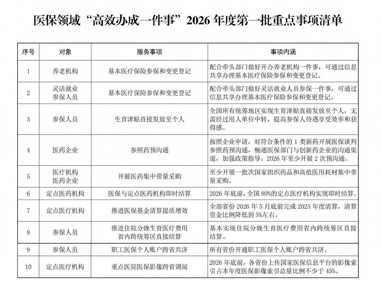 此外,清单明确,2026年底前,全国80%的定点医疗机构实现即时结算;至少开展一批次国家组织药品和高值医用耗材集中带量采购;基本实现住院分娩生育医疗费用省内跨统筹区直接结算。